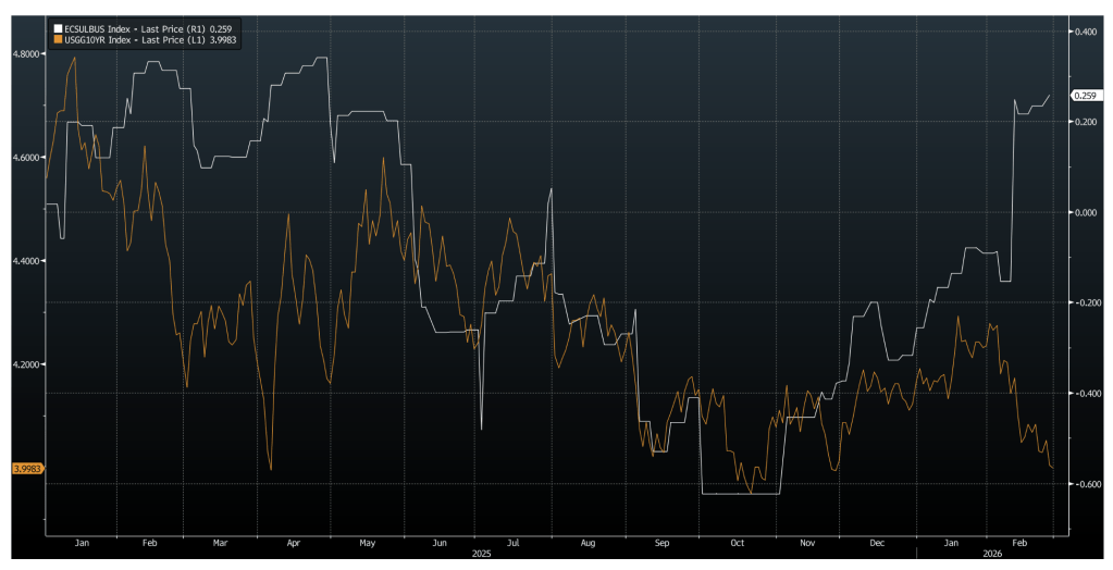 However, treasuries are still demanded by both local and international investors. The global outlook must also be considered since the Fed anchors the front end of the yield curve, while the rest of the curve is determined by global demand, risks, etc. The easing fiscal and inflationary pressures in Japan, amid Takaichi’s election, might partly explain why 10Y yields are at the lowest point since November given the firm and hot growth outlook in the US.