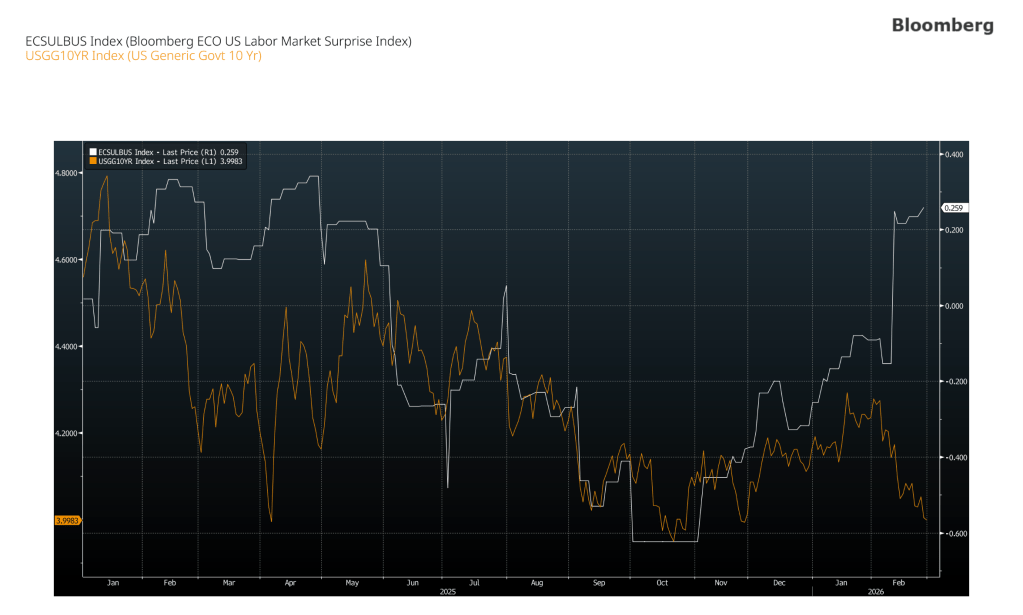 Yields are lagging behind and diverging away from the ongoing macroeconomics backdrop. The Bloomberg US labor market surprise index spiked from -0.16 to 0.26 since the beginning of February, while the yield on 10Y Treasuries continued its downward trend.