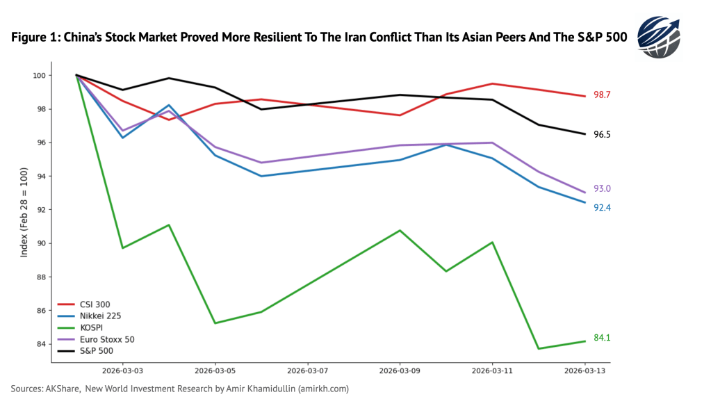 China’s equity market has shown notable resilience during the recent escalation around Iran. While several major Asian benchmarks — including Japan’s Nikkei 225 and South Korea’s KOSPI — sold off alongside the S&P 500, China’s CSI 300 moved far less in relative terms.