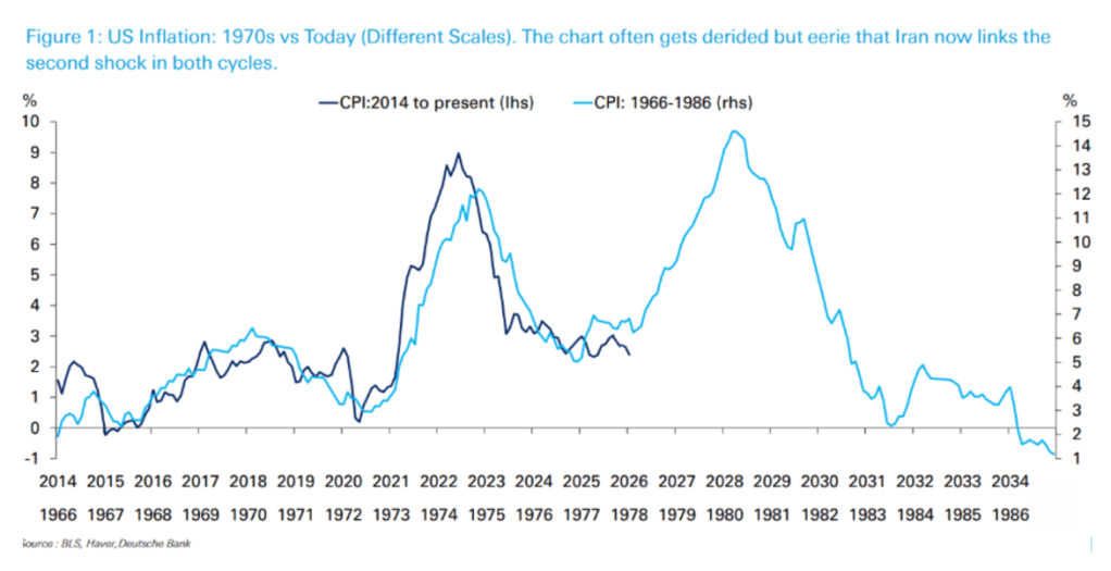 With pre-Iran inflation rates running already above the 2% target and the most recent PPI reading coming at +3.4% YoY (est. +2.9%) in the U.S., the Fed is in a very tough position along with other central banks across the world. As I reiterated previously many times, even before the outbreak of war in Iran, the combination of large fiscal stimulus, very loose monetary conditions, extremely low credit spreads, reduced migration, and lagged effects of tariffs was already exerting upwards pressure on inflation in the U.S. The ongoing conflict will undoubtedly add to the existing trends and put inflation well above current 2.4%. I am expecting it to be around 3.0% by the end of 2026. On top of that, the parallel between the 1970s vs. today is still worth watching, given how shockingly similar CPI trends already have been (Figure 6).