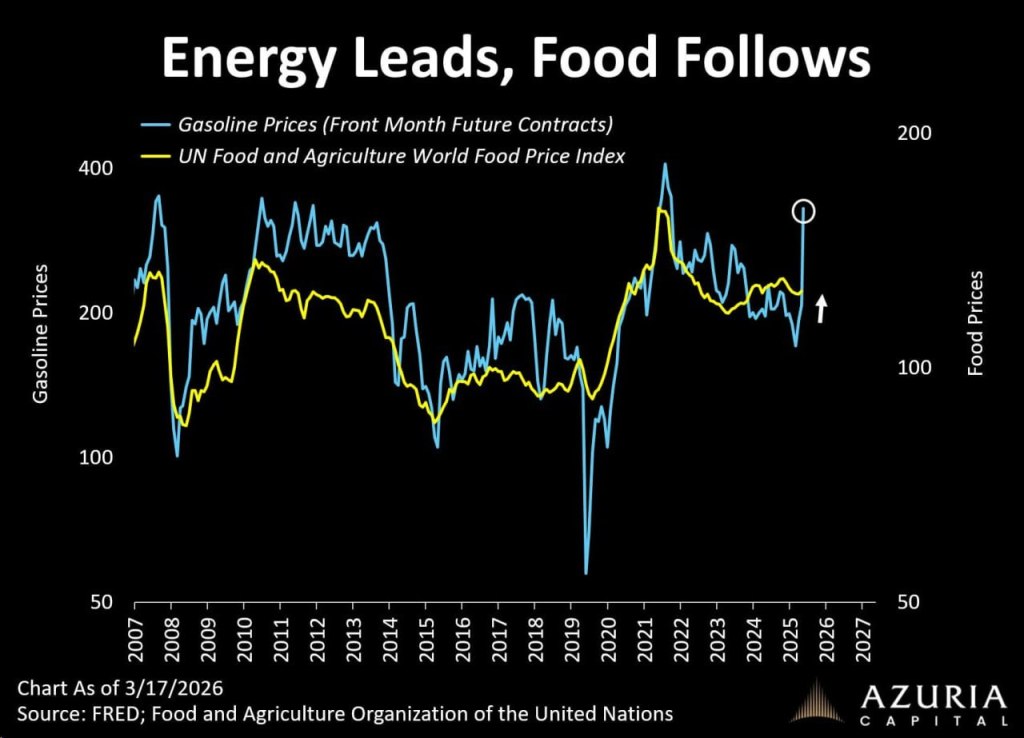 Another risk that is being somewhat underlooked by the media, politicians, and general public is food prices. The Strait of Hormuz is the world’s most critical artery for fertilizers. Roughly 25% to 30% of global nitrogen fertilizer exports pass through this narrow waterway. Moreover, nitrogen fertilizer is made from ammonia, which requires natural gas. As the conflict has sent global LNG (liquefied natural gas) prices up by over 50-70%, the cost of manufacturing fertilizer in the U.S., Europe, and Asia has also skyrocketed. The timing is particularly damaging for the Northern Hemisphere, as the conflict began just as the spring planting season was kicking off. If farmers apply less fertilizer to save on costs, crop yields (the amount of food produced per acre) will drop. Experts warn that even a modest reduction in nitrogen use can lead to disproportionately large declines in the global harvest. In other words, the world and fertilizer and nitrogen-importing countries should prepare for higher food inflation and possible shortages. The historic link of agricultural and gasoline prices provides further evidence for food prices’ upside (Figure 5). This is an immediate risk as it will target the lives of every single household in dependent countries.