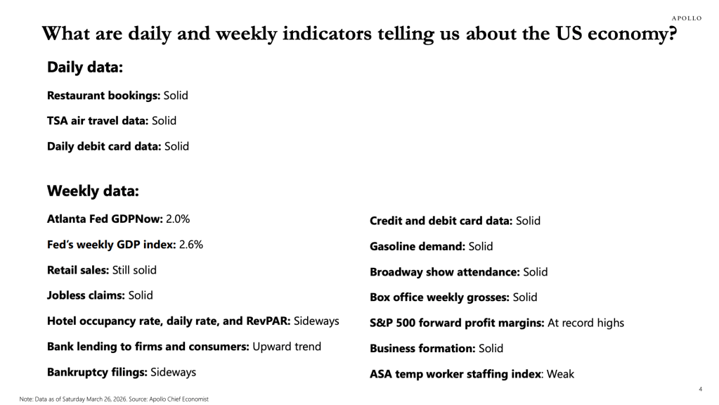 As markets are pricing higher inflation, disruptions in supply chains, and widening energy shortages, central banks over the globe are aligning towards holding or hiking rates. The Fed is not an exception. Fed Fund Futures imply steady rates for 2026 and one cut in 2027 as late as December (Figure 1). Some traders are wagering on Fed hikes even in this year. Although my view is that the conflict will be far more prolonged (than the market currently prices in) with extremely deteriorating and undermining consequences for energy and food markets for the next 12-24 months, meaning that demand deconstructions might outweigh inflation concerns and implying no changes to the rates, there are reasonable arguments for a more hawkish stance. As such, recent Apollo data provides strong evidence for the persistency and robustness of tailwinds for US growth (Figure 2).