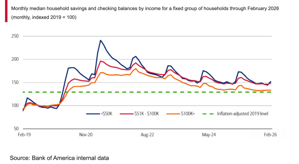 Moreover, since the US economy is K-shaped in nature (see my earlier note on this), the growth in the US will be skewed even more towards AI-related industries, while everything else will see stagnation and recession. Higher energy prices will not hit the US economy immediately, but likely to do so around May-June since median checking and savings deposit balances remained above inflation-adjusted 2019 levels, providing additional cushion for households (Figure 3). Therefore, it all depends on when and how the conflict will be resolved. However, should it all stop tomorrow, the negative impacts will still be there for around the next 6-18 months, meaning that inflation is the key issue for policymakers in 2026 and 2027 for sure. The demand side that was driving the US growth before the Iran war (CapEx, Fiscal Spending, AI) seems to be relatively more resilient and will experience rather short-term fluctuations and possible slowdowns rather than complete demolishment.