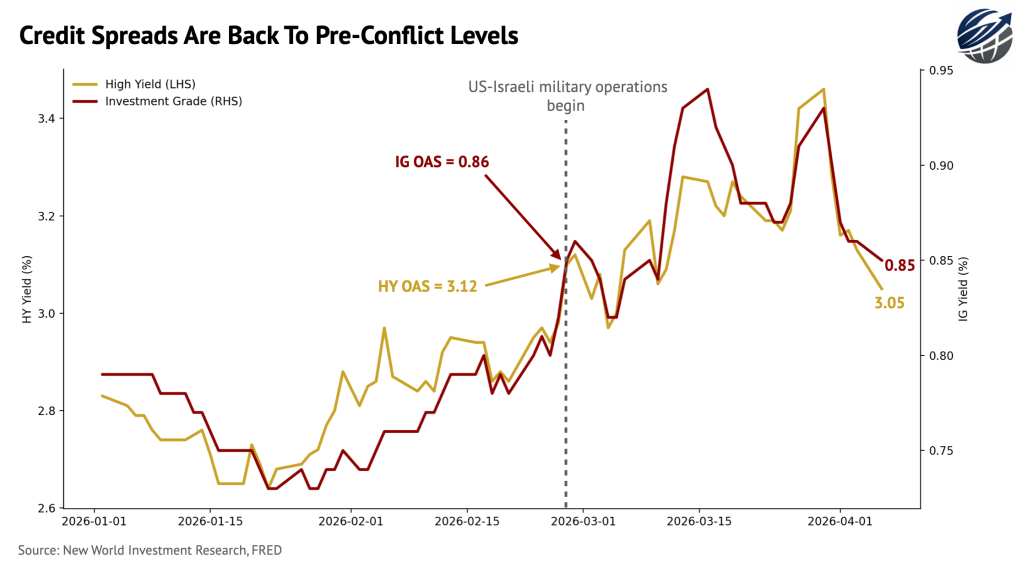 Credit spreads are back to pre-Iran conflict levels. HY OAS is back around 3.05% versus ~3.12% pre-event, and IG is near 0.85% versus ~0.86%. The widening to ~3.4% and ~0.94% was sharp but lacked persistence, with no follow-through into a second leg.